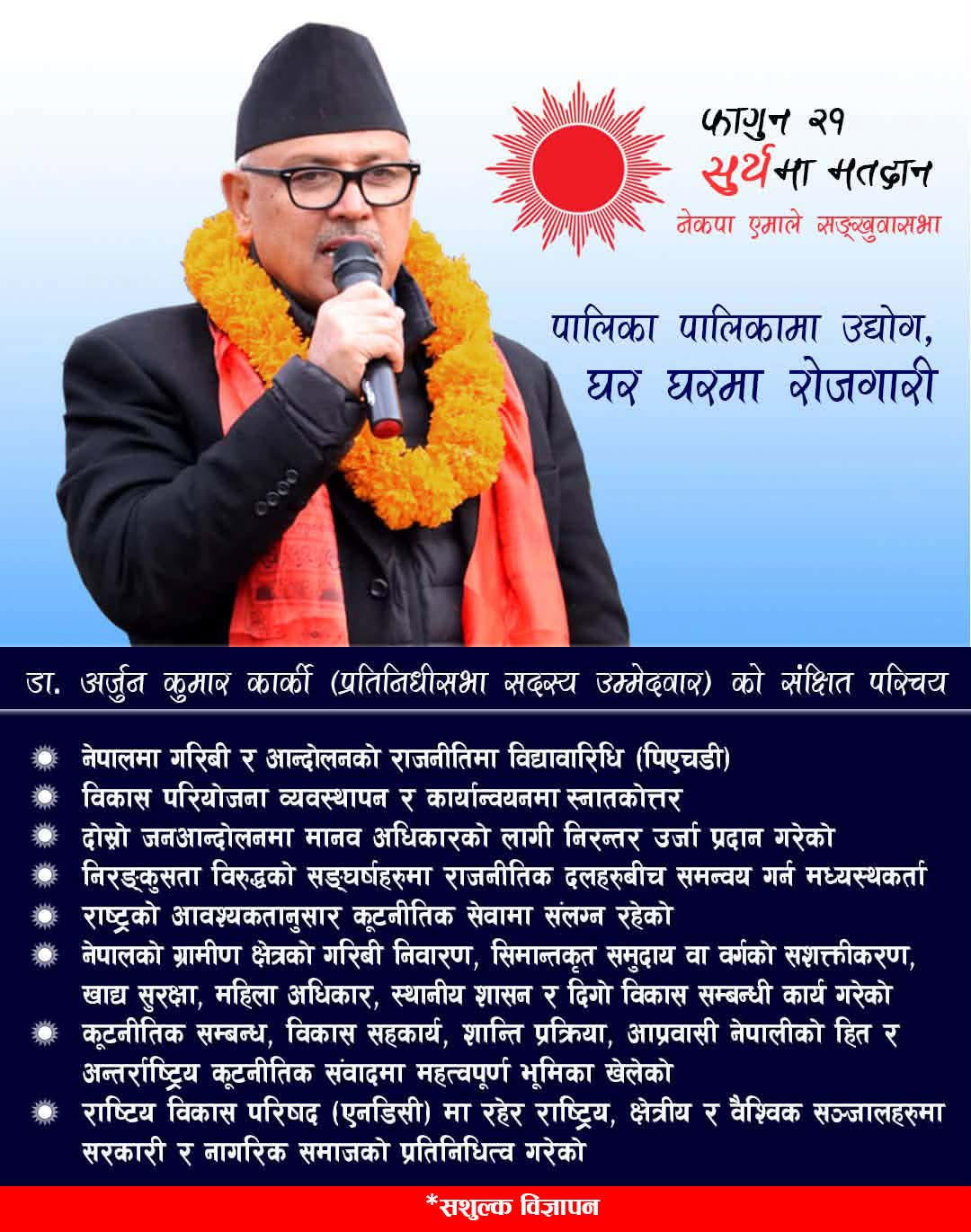 नेकपा (एमाले) संखुवासभाका उम्मेद्वार डा. अर्जुन कुमार कार्कीलाई सुर्य चिन्हमा मतदान गरी विजयी गराऔं । *सशुल्क विज्ञापन
