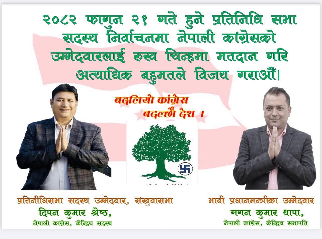संखुवासभाको बिकासमा अहोरात्र खटिरहने दीपन कुमार श्रेष्ठ यतिवेला संखुवासभामा चर्चाको शिखरमा छन् । ग्रामीण बिकासमा स्नातकोत्तर सम्मको अध्ययन पुरा गरेका दीपन कुमार श्रेष्ठ जिल्लाको सबै भुगोल संग परिचित नेपाली काँग्रेसका तर्फबाट उम्मेदवार हुन् । हरेक क्षेत्रको सम्भावना र चुनौतिहरुलाई नजिकबाट बुझेका श्रेष्ठको परिपक्क राजनितिक अनुभव र निश्कलंङ्क छवीले जिल्लाको समग्र बिकासको चाहना पुरा हुने आसा पलाएको छ ।